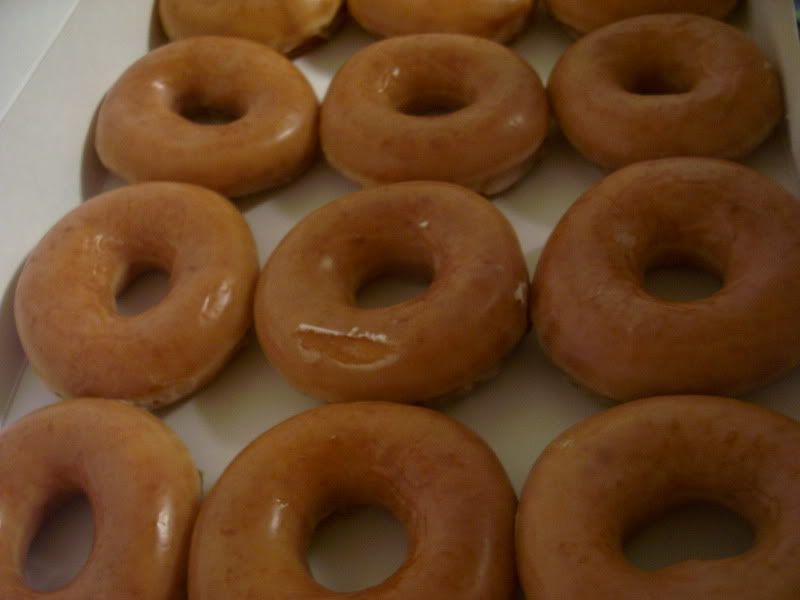 two days ago my friend knocked on my door and asked if my roommate and i wanted krispy kreme doughnuts for breakfast. d'oh! beats our buttery and raspberry jam sandwiches anytime. this stuff is seriously dope...doughnutty divine and best i've ever had. glazed sugar on the outside, soft and chewy on the inside. of course we had second helpings.